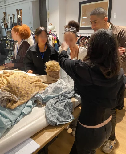 Les élèves se sont ensuite répartis en 4 groupes, sous la direction de responsables d’ateliers de la maison, pour réaliser les étapes préalables de la confection d’un T-shirt (Mesures, patronage, …)