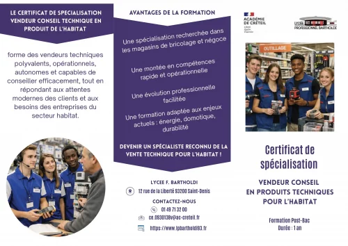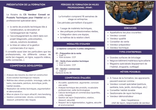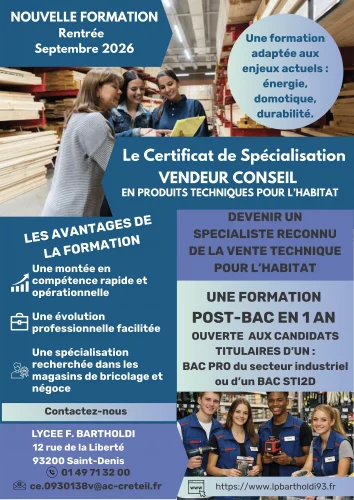 Ce Certificat de Spécialisation (CS) offre une qualification complémentaire pour exercer le métier de vendeur-conseil spécialisé dans les produits techniques pour l’habitat.